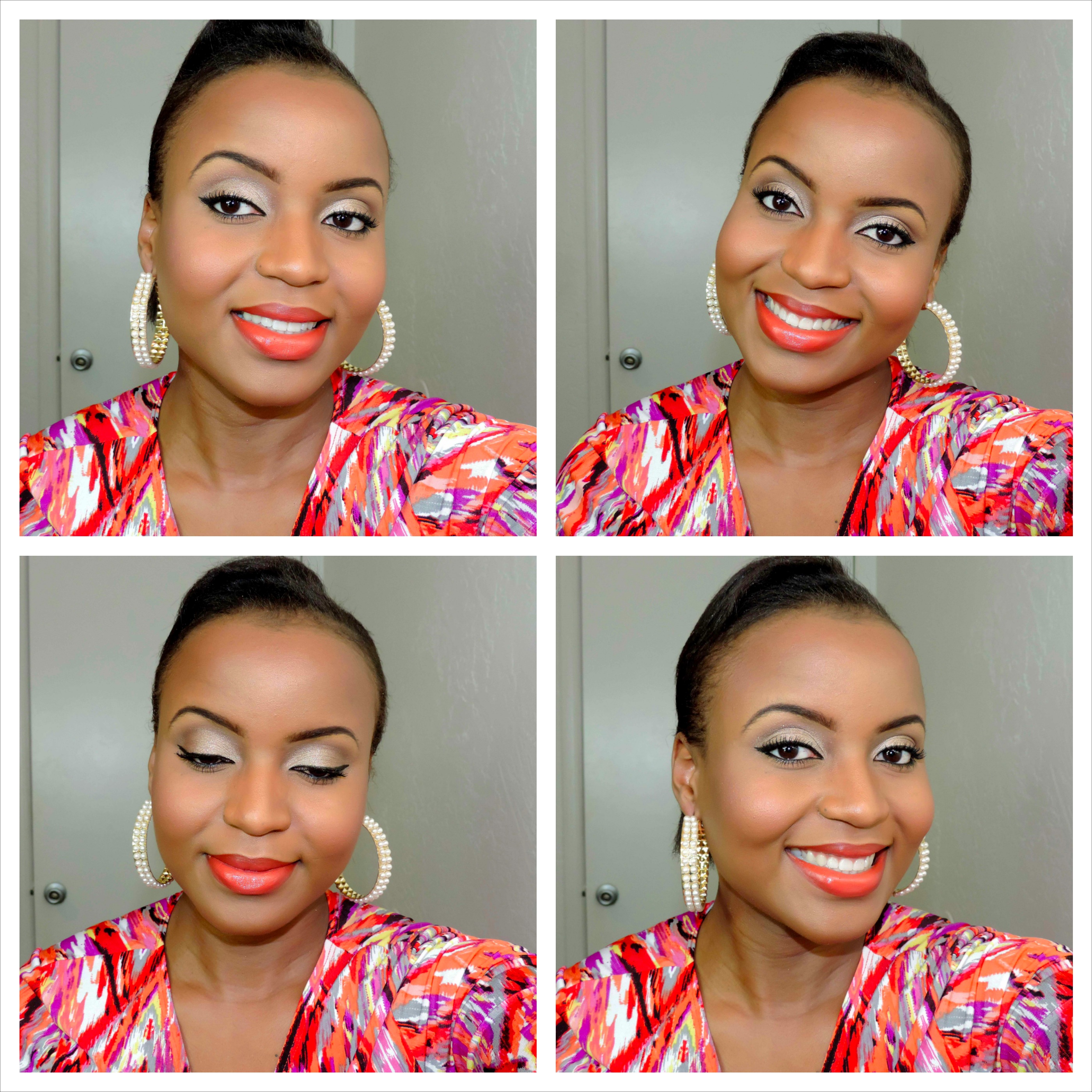 I did this look on a Sunday before heading out to church. I wanted to complement the peachy orange color of my dress. I wanted bold lips so the eye makeup had to be subtle. I used the Laura Geller eye shadow palette in Golden Sunset. The texture of the eyeshadow is lovely and it slides onto the eye lid when applied.